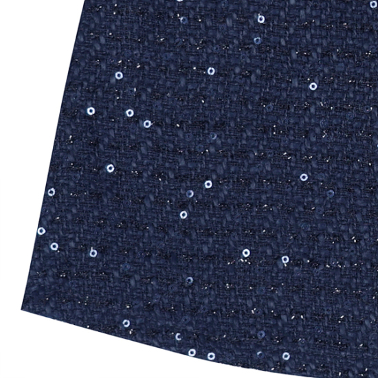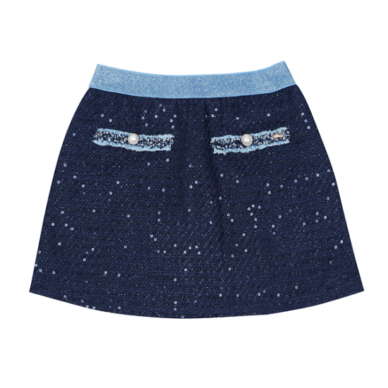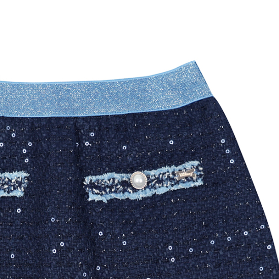 상세설명-은은한 펄감과 스팽글 장식이 들어간 트위드 소재를 사용한 A라인 스커트입니다. 허리에 블루 펄 밴드와 장식 포켓에 해지 프릴 테잎을 포인트로 사용한 스타일로 네이비 가디건이나 같은 소재 자켓과 코디하기 좋은 스타일입니다.