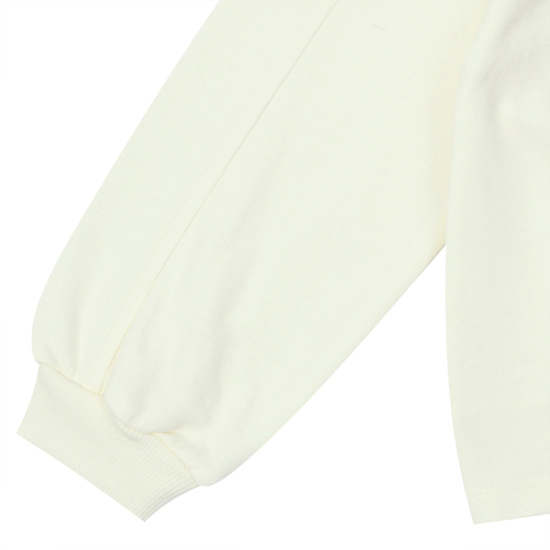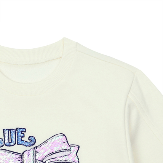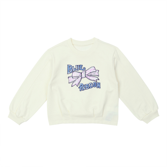 상세설명-앞단에는 턱 장식으로 일자로 내려오고 뒷쪽에만 립단을 넣어 변형을 준 맨투맨 티셔츠입니다. 앞에 스팽글 리본 자수로 블한 포인트를 살린 티셔츠입니다.