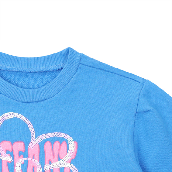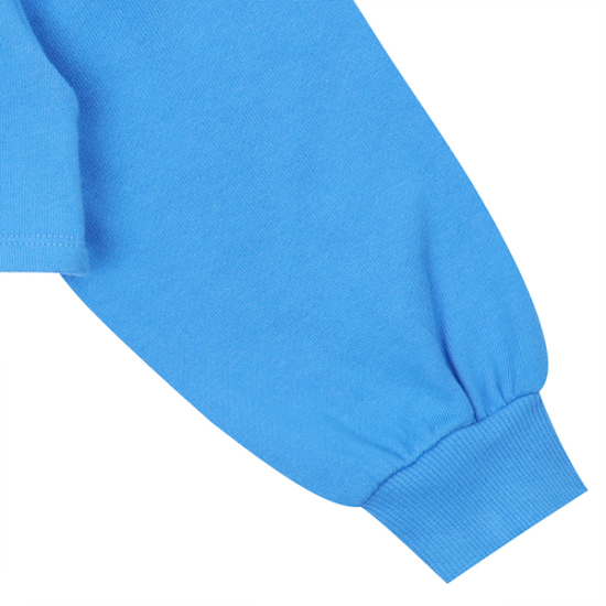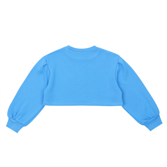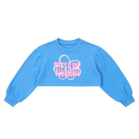 상세설명-블루컬러의 크롭맨투맨 티셔츠로 기본골지티셔츠와 레이어드해서 입으면 좋은아이템으로 블링한 꽃스팽글자수와 로고플레이가 포인트인 아이템입니다.