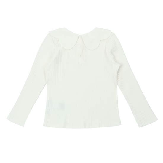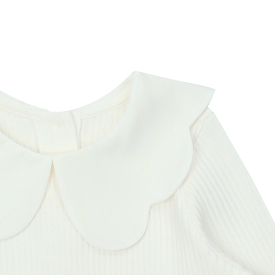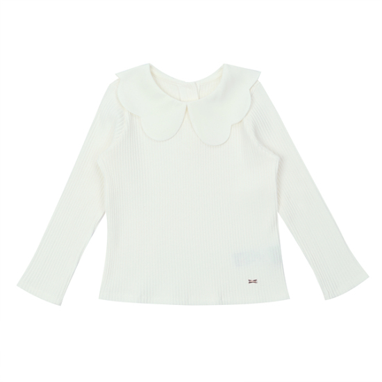상세설명-귀여운 스칼럽 카라의 티셔츠로 몸판이 골지스판원단으로 되어있어 활용성이 좋고, 귀여운 카라가 포인트인 아이템입니다.