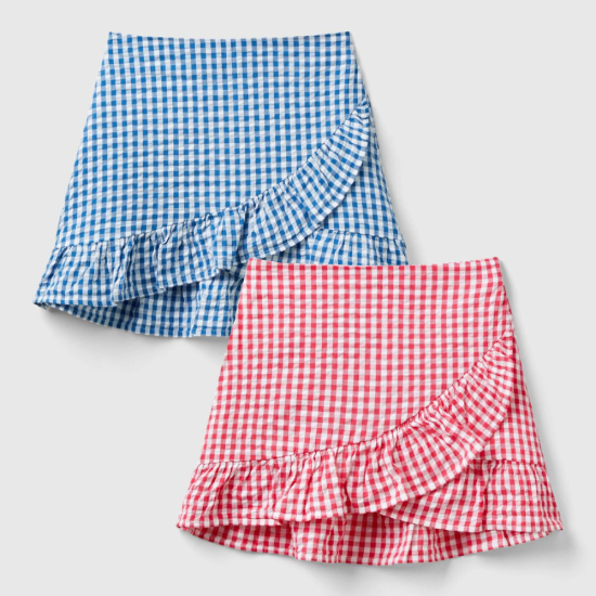 청량한 컬러감의 체크 패턴에 러플 디테일이 돋보이는 랩스타일 스커트.