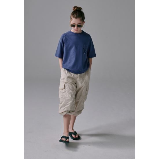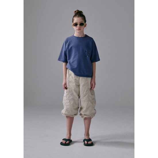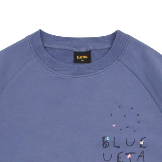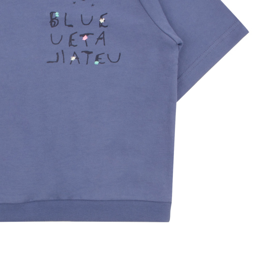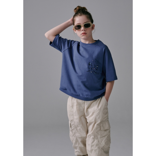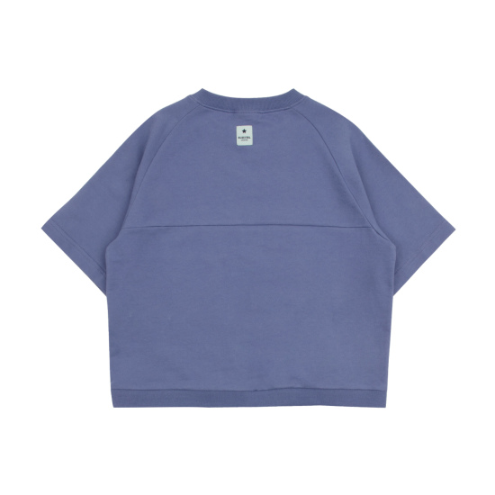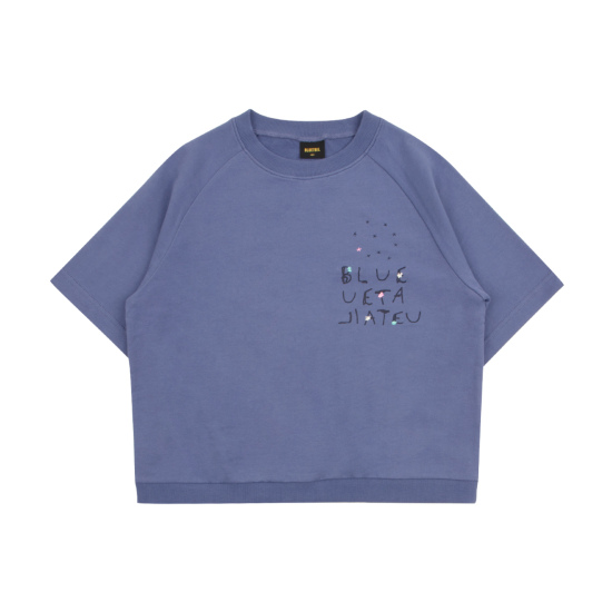 바이올렛 컬러의 반팔 기장 맨투맨입니다. 곡선을 살린 레글런 소매와 밑단을 립으로 모아주어 여아스러운 핏이 귀여운 아이템입니다. 손으로 그린듯한 별들과 손글씨의 블루테일 글자들을 앞쪽 가슴팍 프린팅으로 포인트 주었습니다.
