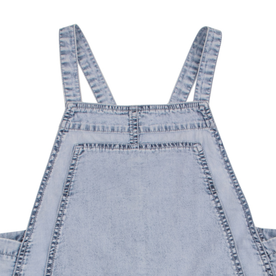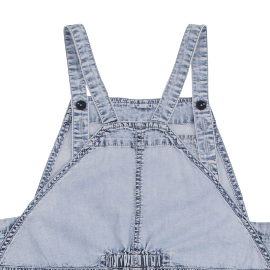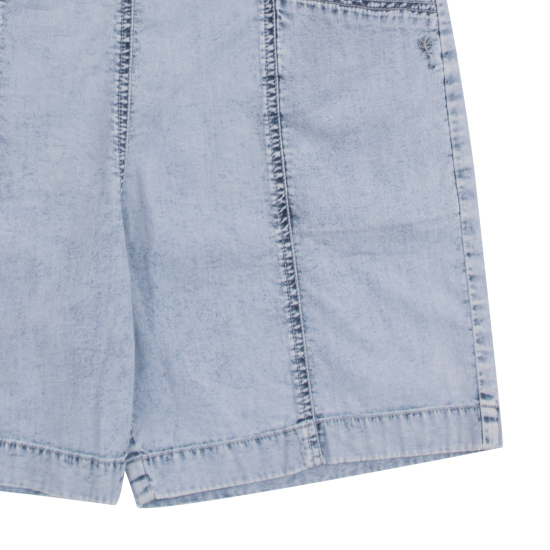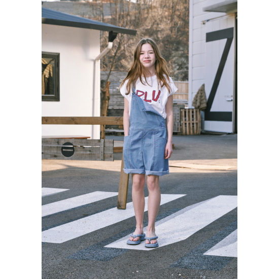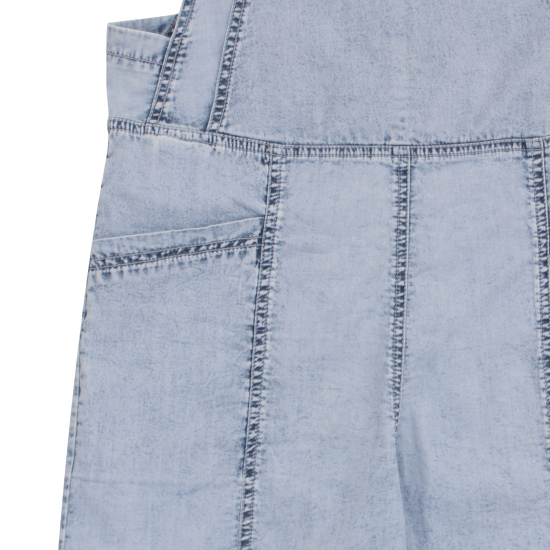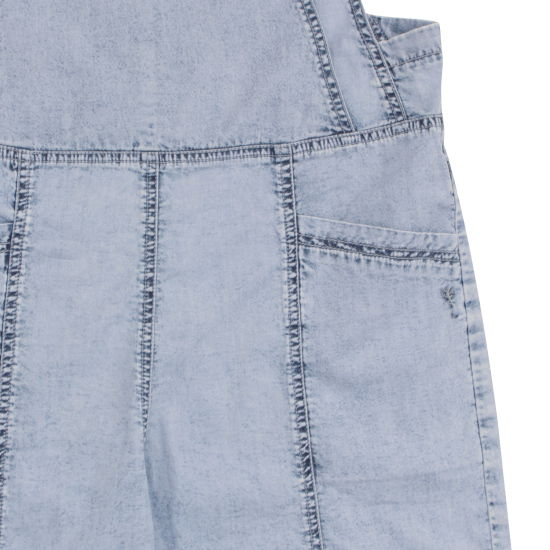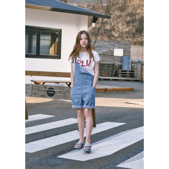 감각적인 아이시한 스카이블루 컬러로 제안한 반바지 데님 점퍼팬츠입니다. 스노우 워싱기법으로 빈티지한 무드를 느낄수있습니다.어깨끈은 단추로 조절할 수 있도록 하였습니다.뒤쪽에는 이밴드를 넣어 실루엣을 잘 잡아주도록 해주었습니다.앞뒤로 자수와 컬러라벨로 포인트를 주었습니다. 롤업 혹은 밑단을 접지 않고도 웨어링하여 활동적인 워크웨어룩을 연출할수 있습니다.