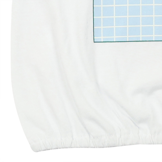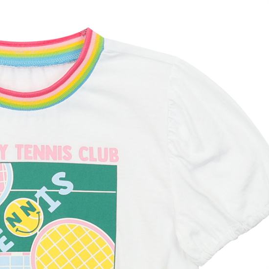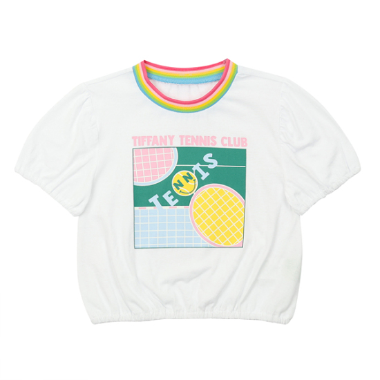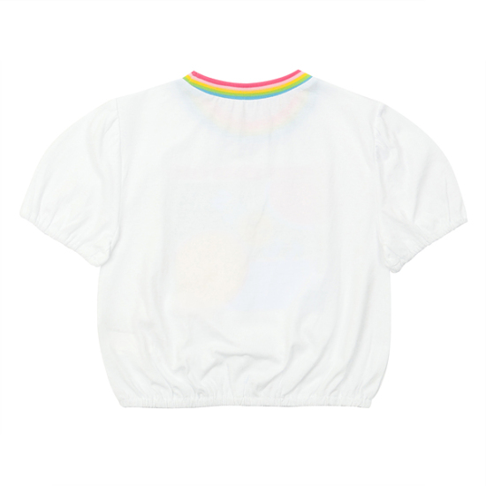 상세설명-깔끔한 화이트 라운드티로 소매와 밑단에 밴딩처리를한 티셔츠로 무지개 시보리넥이 한층더 포인트를 살려줍니다.