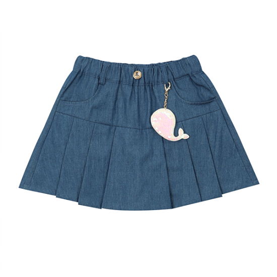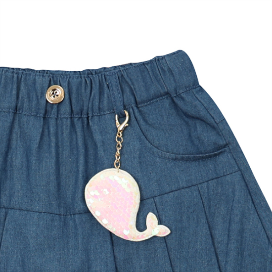 상품설명-해지 소재 큐롯 팬츠로 앞에서 보면 주름 스커트 처럼 보이는 스타일입니다. 스팽글 고래 장식으로 블링한 포인트를 준 팬츠입니다.