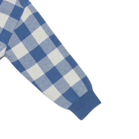 블루컬러의 깅엄체크 패턴으로 클래식한 스타일로 니트,스웨터나맨투맨등 다양한 이너에걸치기 좋은 스타일 입니다.