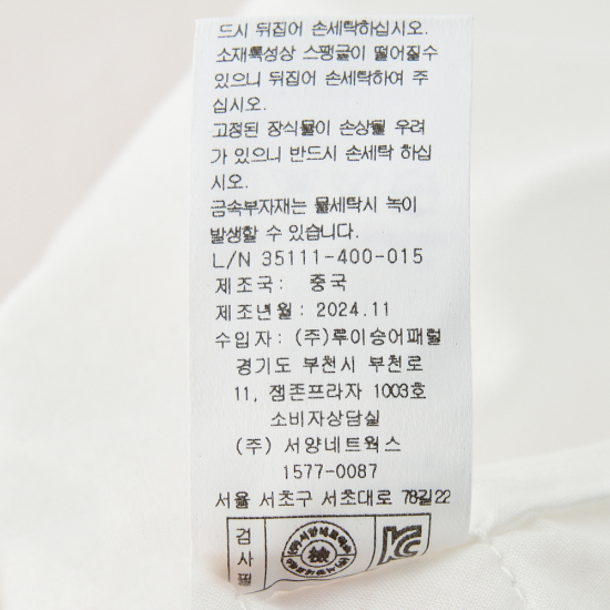 소 재......겉감1-나일론100% / 겉감2-폴리에스터100% / 겉감3-폴리에스터100% / 겉감4-폴리에스터100% / 겉감5 폴리에스터100% / 안감-면100%