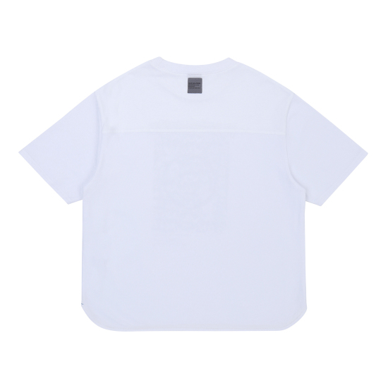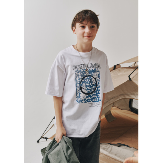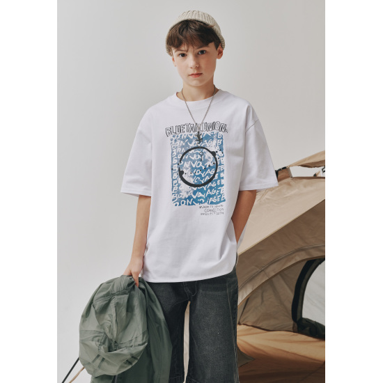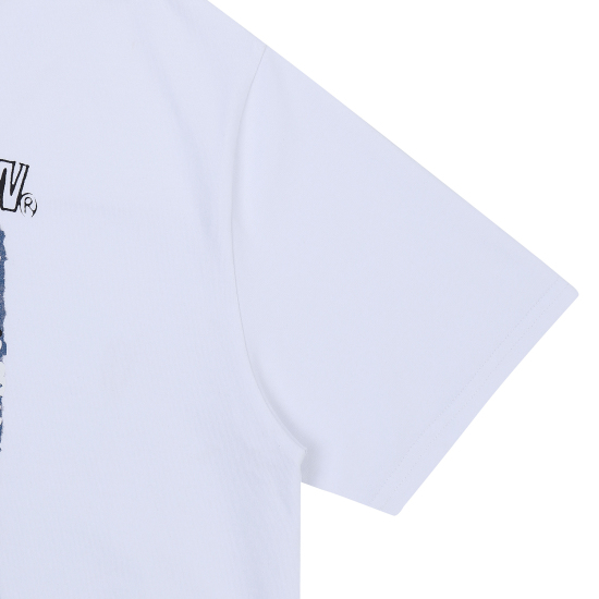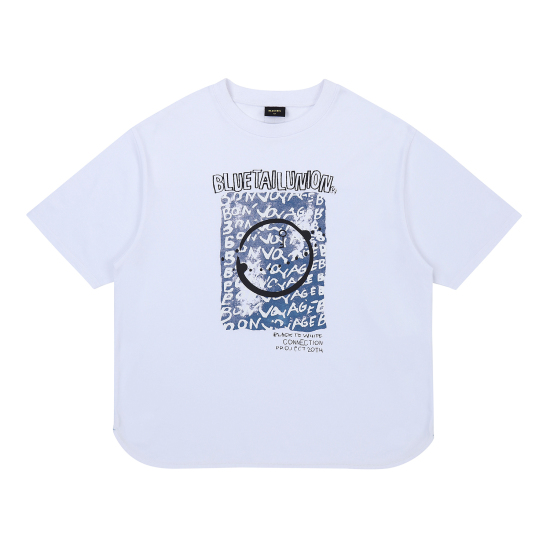 클린한 화이트 컬러의 반팔 티셔츠입니다. 넉넉한 상동과 살짝 짧은 기장의 소매로 제안하였습니다. 유럽에서 볼법한 이국적이면서 아티스틱한 프린팅이 인디고 컬러로 빈티지하게 워싱되어 날라간 듯한 효과로 포인트를 주었습니다.