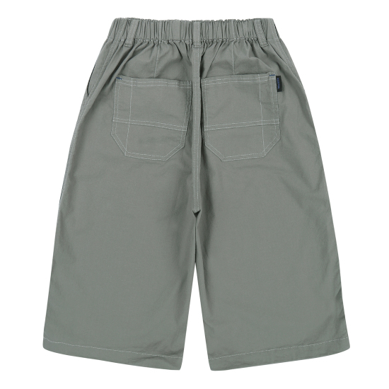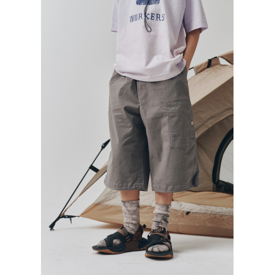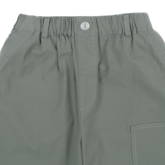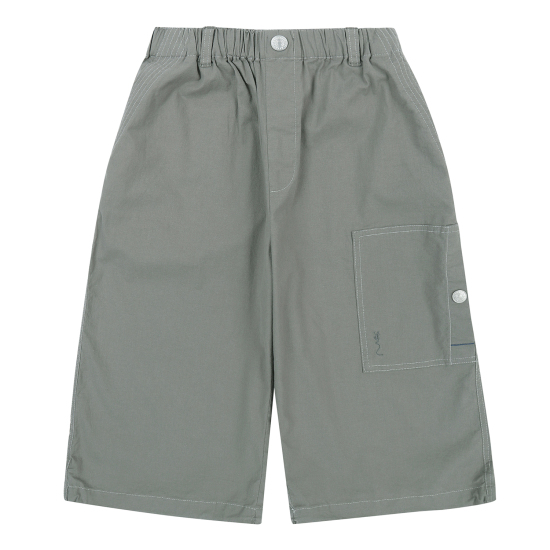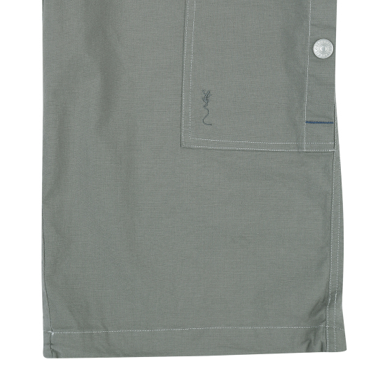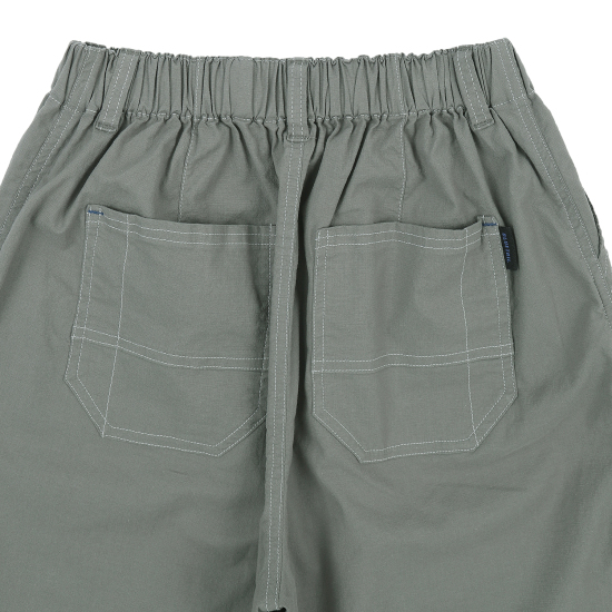 라이트베이지 컬러로 제안한 통고무줄 7부 우븐 팬츠입니다. 사선 앞 포켓에 넓은 5줄 스티치로 자연스런 파카링을 유도하였고, 허벅지 한 쪽에 주원단 포켓이 시크한 워커 감성을 느끼게 합니다. 도마뱀 자수와 라벨로 포인트를 주었고 바지 밑단에 엘라스트링으로 핏을 조절할 수 있습니다.