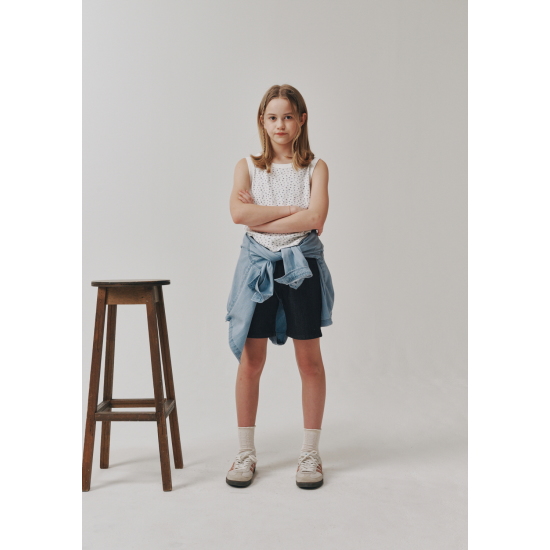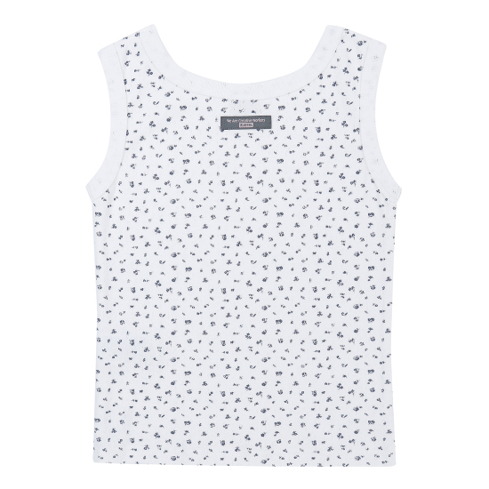 클린한 화이트 컬러로 제안한 플라워 프린팅 슬리브리스입니다. 단독으로 입어도 부담스럽지 않은 안정적인 어깨 넓이와 암홀 라인을 제안하였고 레이어드에도 용이합니다. 도마뱀 자수와 라벨로 컬러 포인트를 주었습니다.