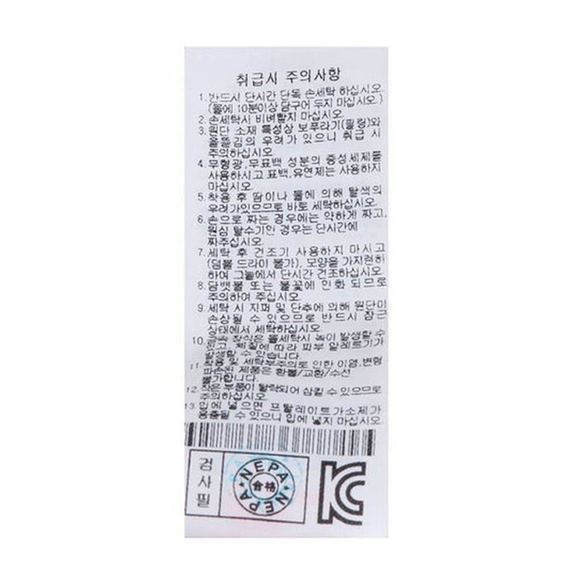 | 세탁방법 및 취급시 주의사항 | 1.반드시 단독으로 손세탁 하십시오. 2.세탁시 탈색의 우려가 있으니 다른 섬유 제품과 함께 세탁하지 마십시오.3.세탁시 반드시 뒤집어 세탁하십시오.4.탈색의 우려가 있으니 삶지 마십시오.5.세탁 전 후 20분 이상 물에 담궈두지 마십시오.6.세탁시 표백제 성분이 있는 세제는 삼가하십시오.7.제품에 부착된 단추, 장식물 등이 탈락되면 물거나 삼키지 않도록 주의 하십시오.8.인화성 물질에는 가까이 하지 마십시오.9.세탁방법을 지키지 않은 이염 및 오염 발생 제품은 교환 및 환불이 불가합니다. |