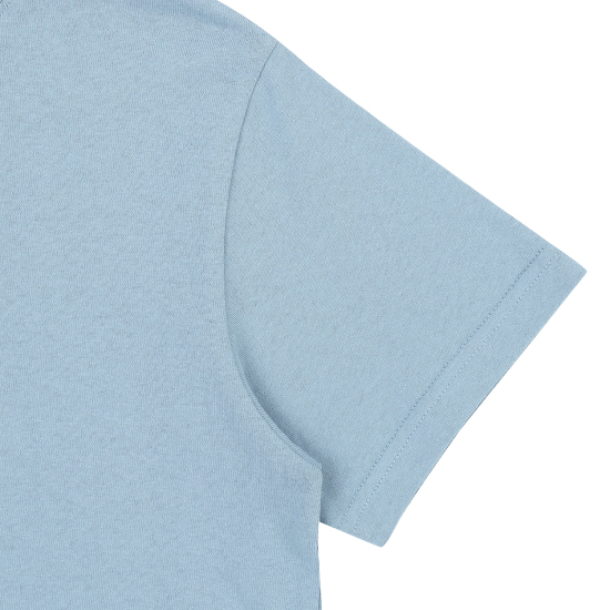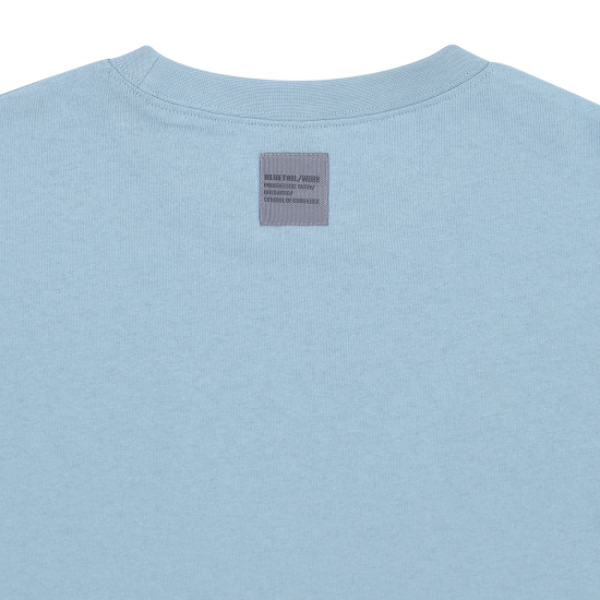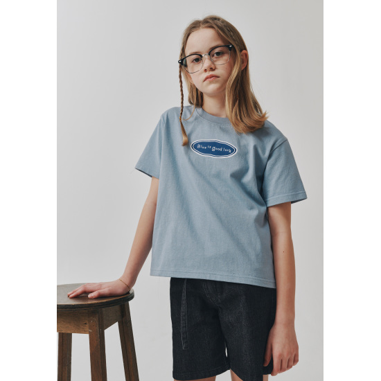 크롭 기장으로 제안한 스카이블루 컬러 반팔 티셔츠입니다. 손으로 쓴 듯한 레터링으로 서핑보드가 연상되게 나염 포인트를 주었습니다. 나염 컬러 조합이 시원한 컬러 포인트를 준 상품입니다.
