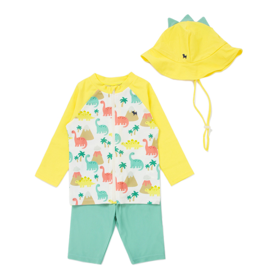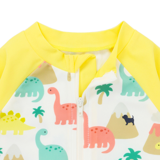 공룡 패턴의 집업 래쉬가드 세트 입니다. 앞 지퍼형 집업 래쉬가드로 입고벗기 편리합니다.