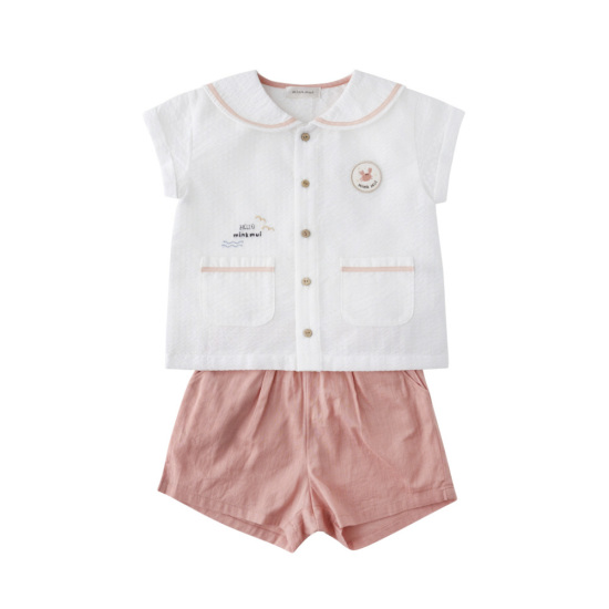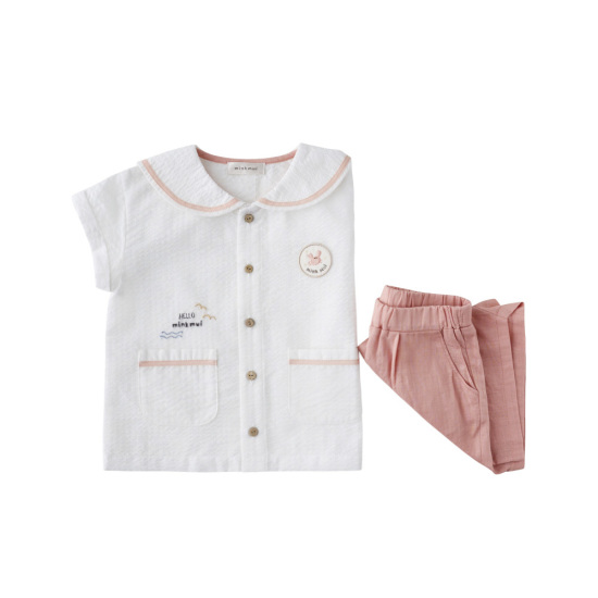 퓨어한 아이보리 반팔 셔츠와 오렌지 팬츠가 매력적인 쁘띠크랩링클 상 하SET입니다.