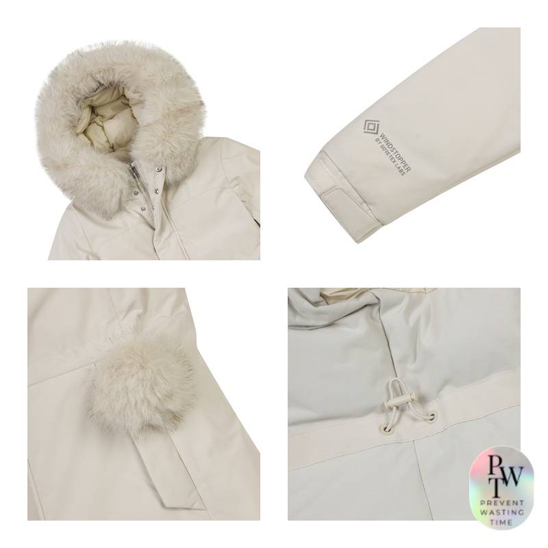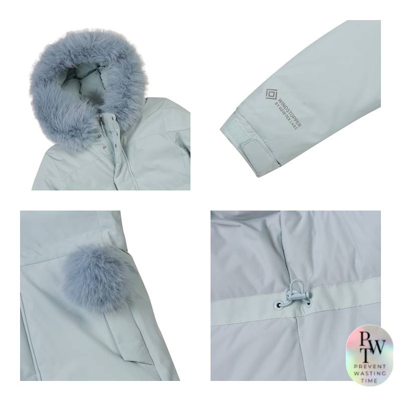 겉감 : 폴리에스터 100%, 안감 : 폴리에스터 100%, 안감2 : 나일론 100%, 충전재 : 깃털 20%, 충전재 : 우모(거위) 솜털 80%, 충전재2 : 폴리에스터 100%, 후드털 : 폴리에스터 100%