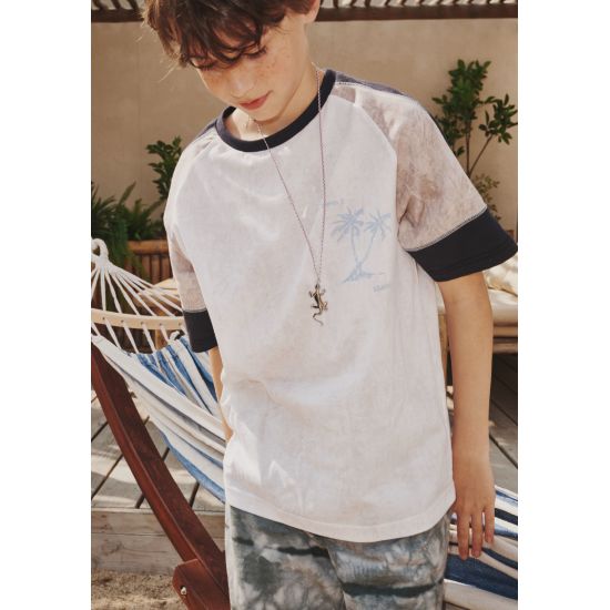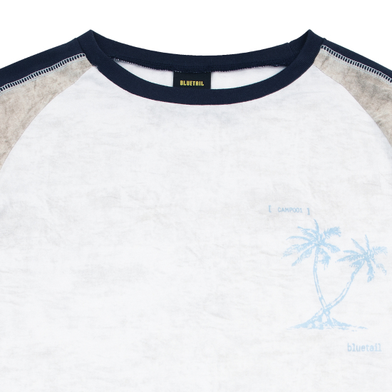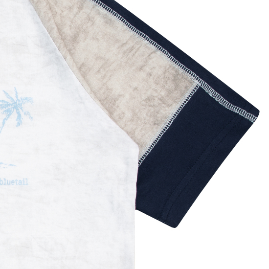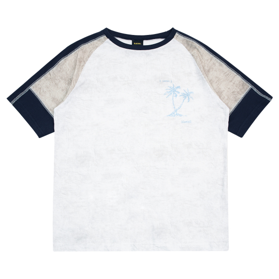 베이지, 네이비 배색이 들어간 컬러 블록 반팔 티셔츠입니다. 앞 뒤 소매 변형을 주고 어깨부터 소매까지 패널을 넣어 유니크하게 제안한 상품입니다.