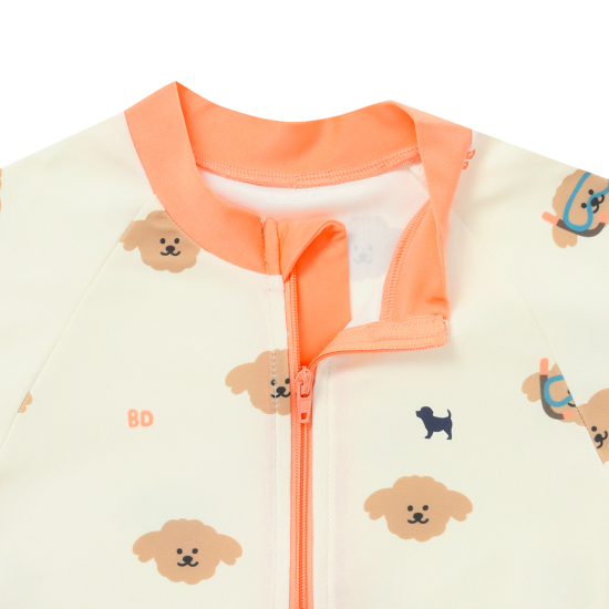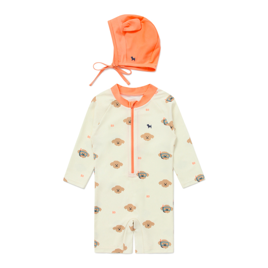 블루독베이비의 시그니처 도기를 사용한 패턴 올인원 수영복 입니다.