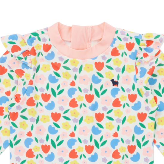 멀티 플라워 패턴의 래쉬가드 세트입니다. 뒷지퍼가 있어 입고 벗기에 편리