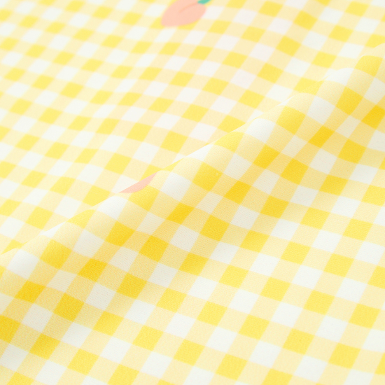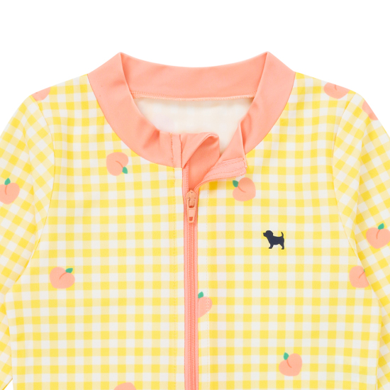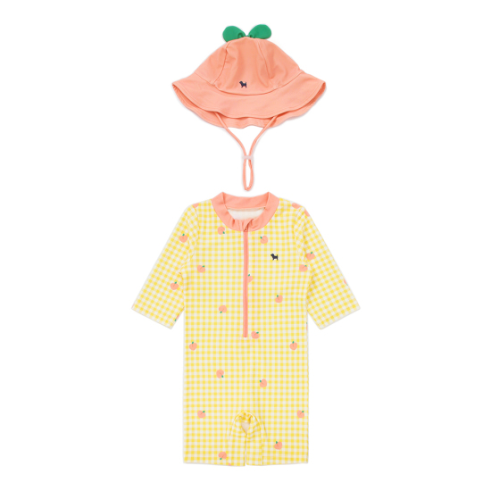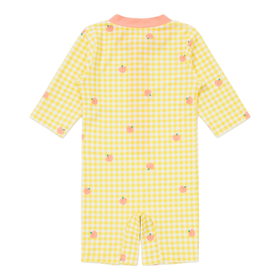 미니 체크 패턴에 복숭아 그래픽이 올라간 올인원 수영복 입니다.