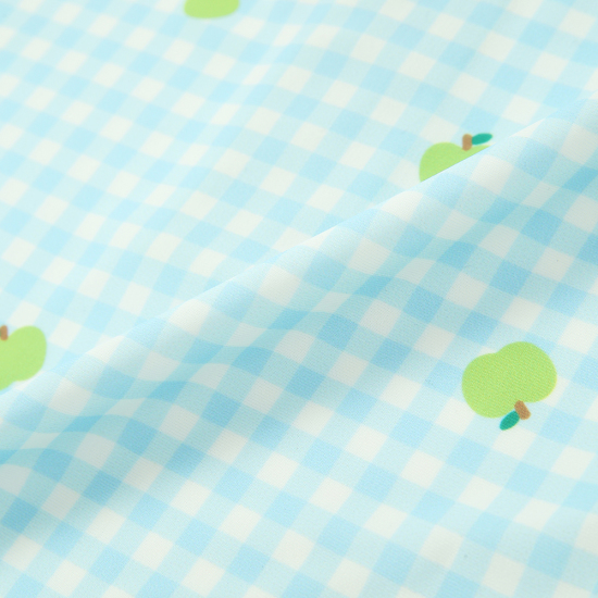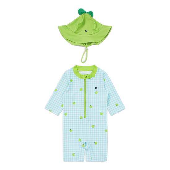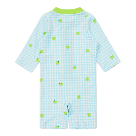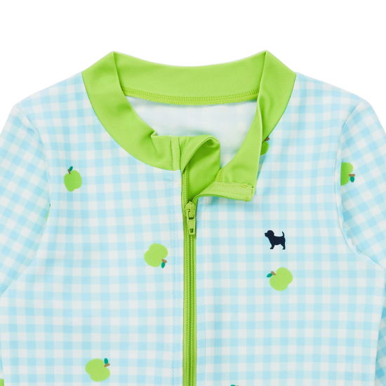 미니체크 패턴에 사과 그래픽이 올라간 올인원 수영복 입니다.