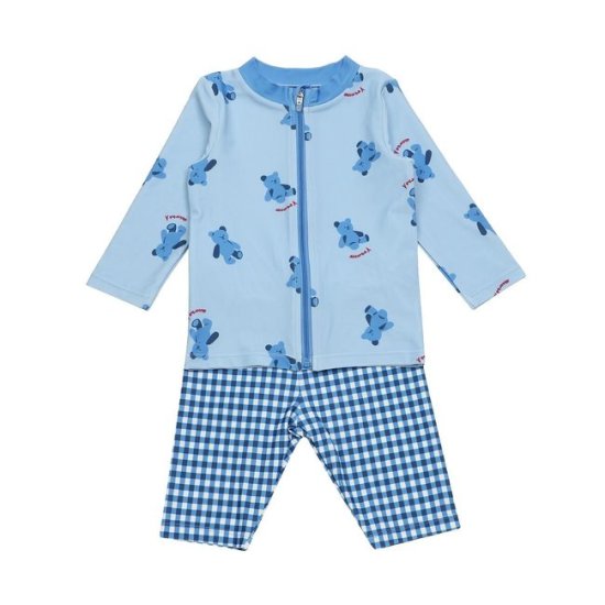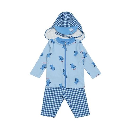물놀이할 때 편하게 입을 수 있는 레쉬가드로 귀여운 모자까지 세트로 구성되어 있습니다.