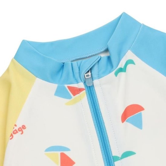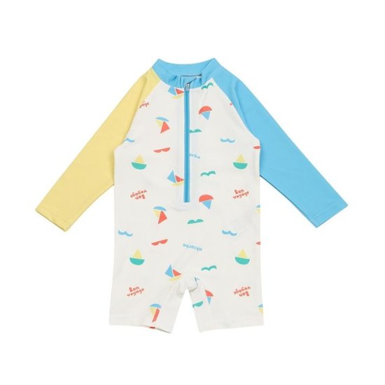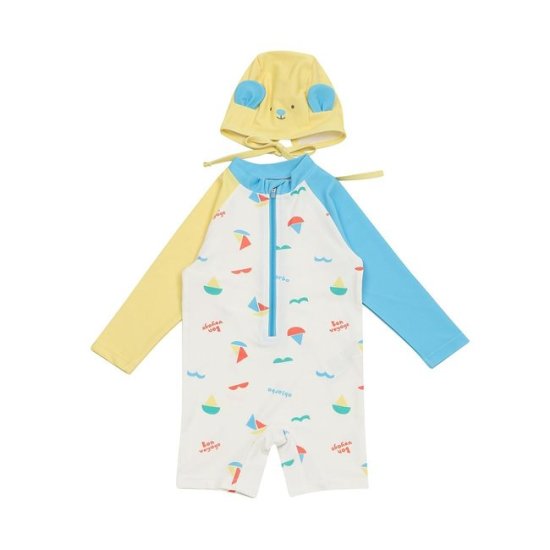 물놀이할 때 편하게 입을 수 있는 레쉬가드로 귀여운 모자까지 세트로 구성되어 있습니다.