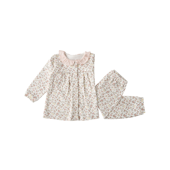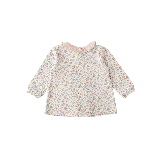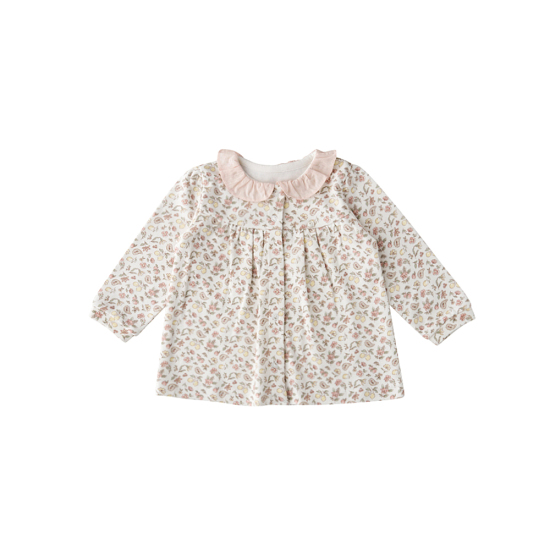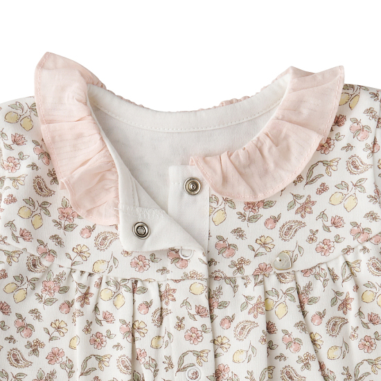 꽃과 과 일에 페이즐리를 믹스한 패턴이 들어간 내의에 프릴을 매치해 포인트를 주었습니다. 여아에게 선물하기 용이한 아이템 입니다.