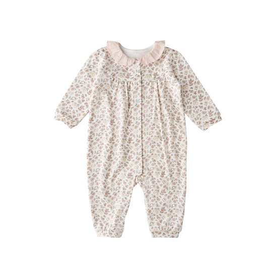꽃과 과일에 페이즐리를 믹스한 패턴이 들어간 우주복에 프릴을 매치해 포인 트를 주었습니다.