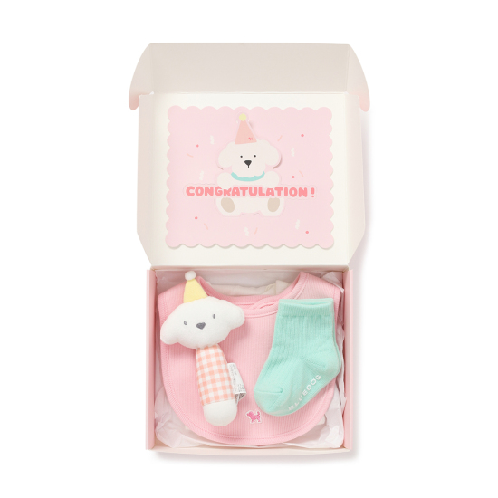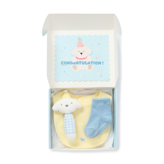 깔끔한 디저인의 바디수트와턱받이,양말,딸랑이가 세트로 구성된 선물용으로 딱 좋은 아이템입니다