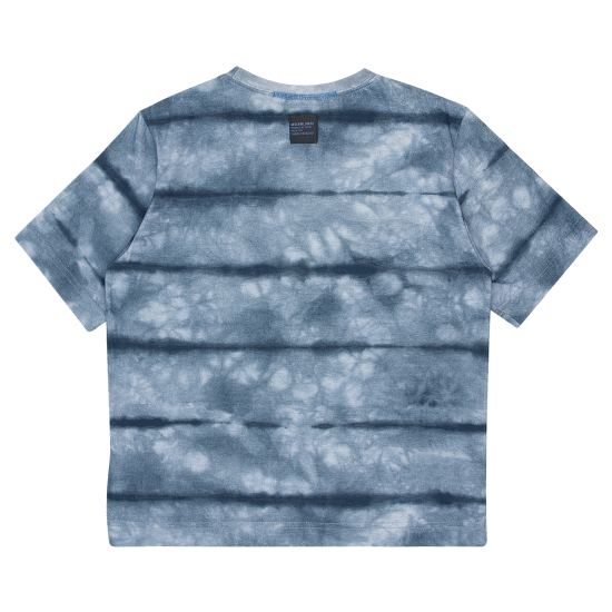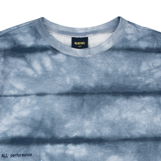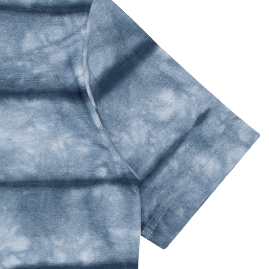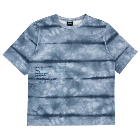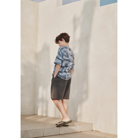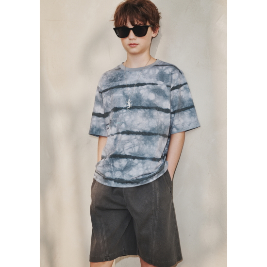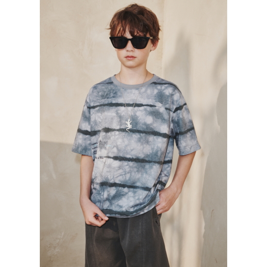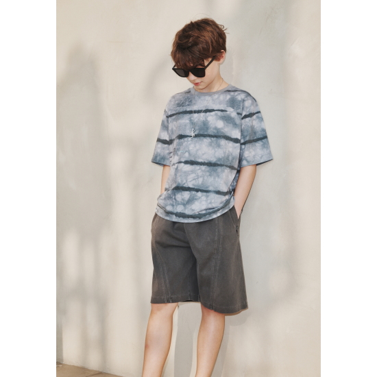 다잉한 듯한 전판 패턴이 마치 스트라이프 같은 차콜 컬러의 반팔티셔츠입니다. 레터링 나염 포인트를 언발란스한 위치에 스미듯이 찍어 빈티지한 효과를 주었습니다. 넥 뒤쪽으로 배색실 가이룹빠 스티치로 컬러 포인트를 준 상품입니다. AZC1PT05CG과 같은 패턴으로 제안하였습니다.