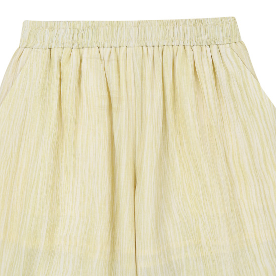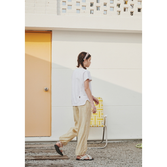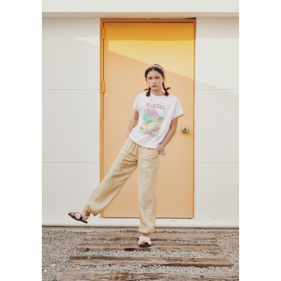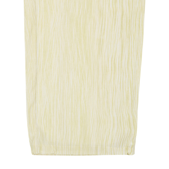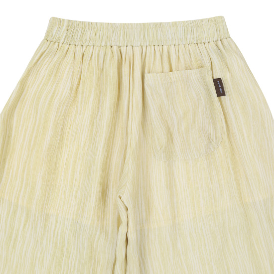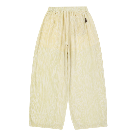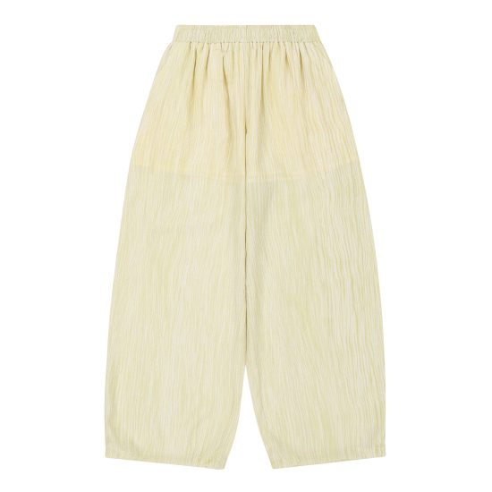 은은한 옐로우 패턴과 가볍고 찰랑이는 얇은 원단의 조거팬츠입니다. 바지 안쪽에 아사 안감을 사용해 비침을 방지하였고 바지 밑단에 엘라스트링을 넣어 핏을 조절할 수 있는 상품입니다.