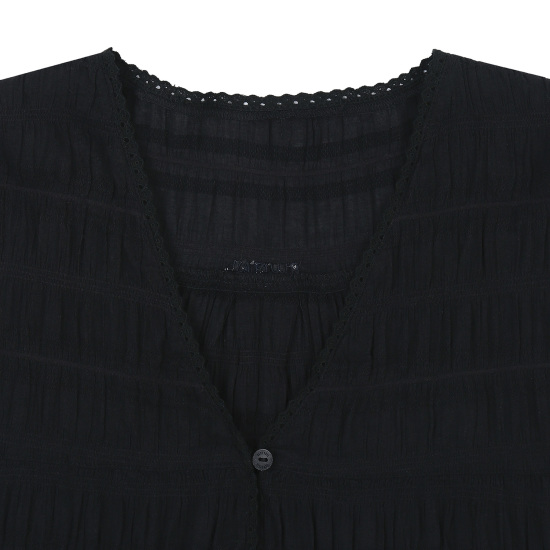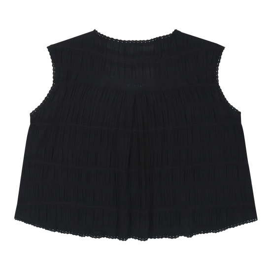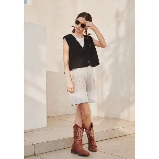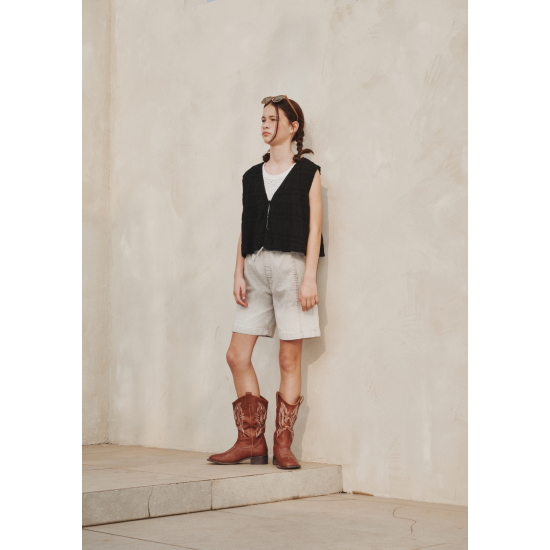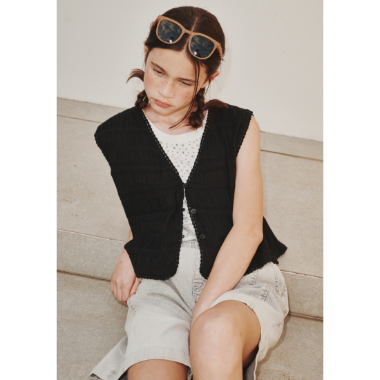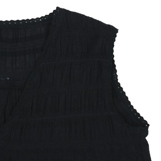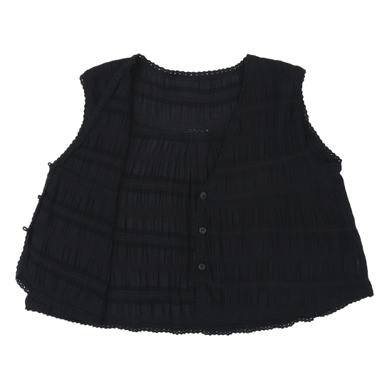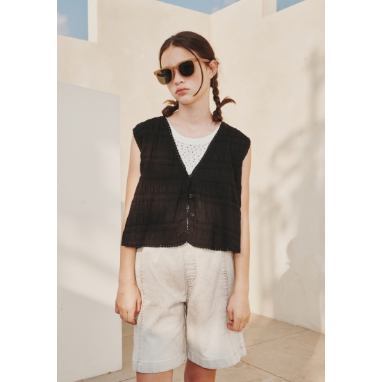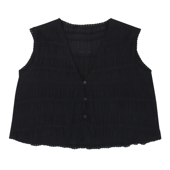 반팔 티셔츠와 레이어드 하기 좋은 블랙 컬러 V넥 우븐 베스트입니다. 크롭한 기장에 풍성한 주름 분량을 넣어 트렌디한 룩을 연출할 수 있습니다. 가슴선 밑으로 절개 라인을 주어 주름 분량을 넣어 입었을 때 부담스럽지 않으며 보호시크(보헤미안+시크의 합성어) 코디에 빠질 수 없는 상품입니다.