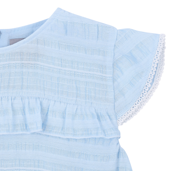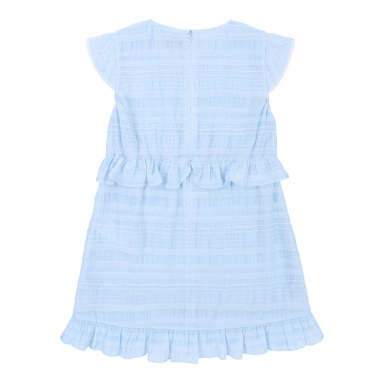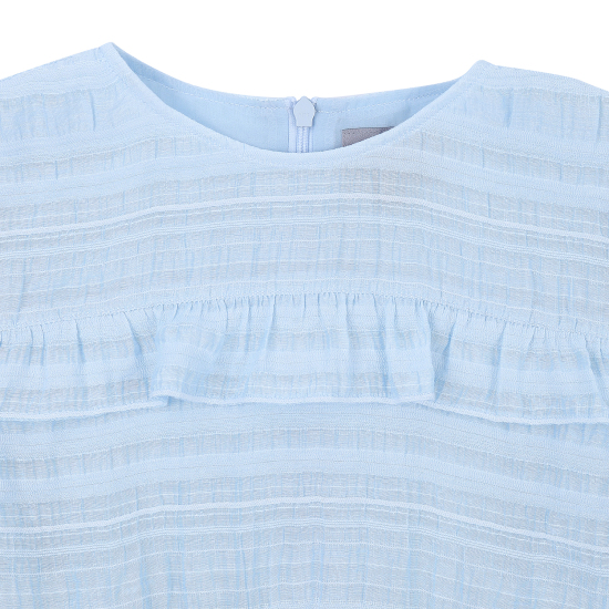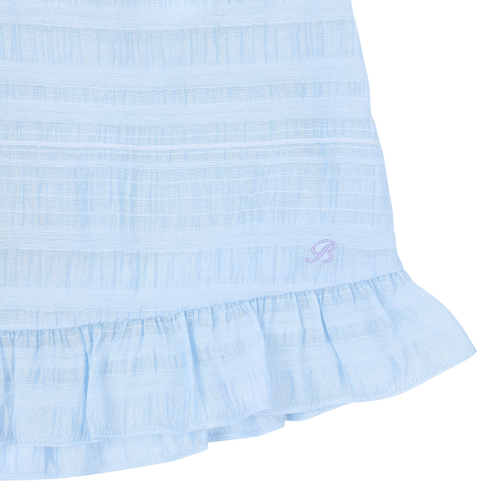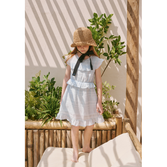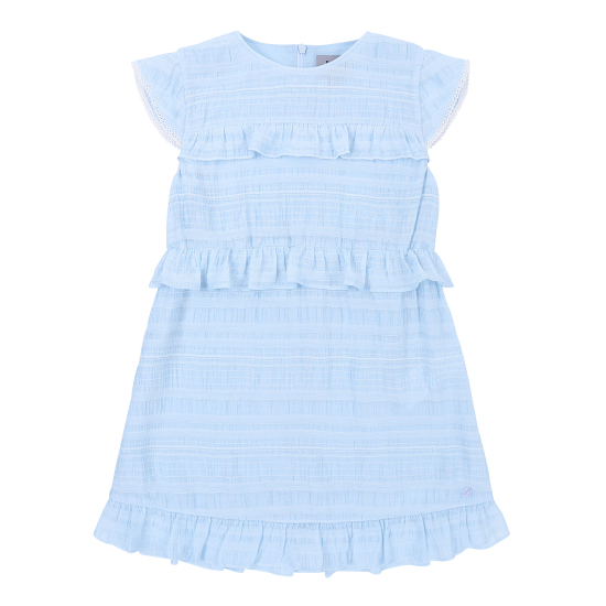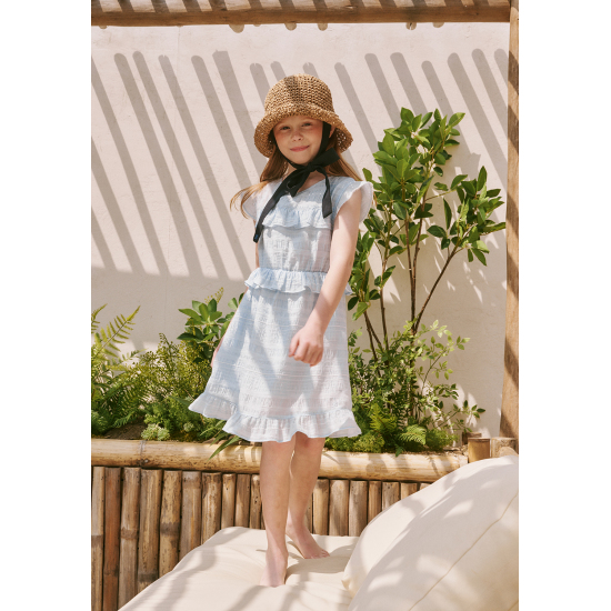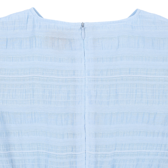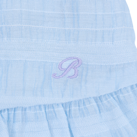 다양한 조직의 레이어드가 돋보이는 쟈가드 소재를 사용하여 스카이 블루의 고급스러운 컬러감을 보여주는 원피스입니다. 사랑스러운 러플 디테일과 허리에 편안하게 밴딩이 있어 활동감이 좋은 아이템입니다. 짧게 팔을 덮어주는 길이감의 소매가 리조트한 분위기를 더해주며, 같은 소재의 스크런치를 함께 셋업하여 연출하거나 베이지 밀짚 모자를 코디하여 세련된 여름 리조트룩을 제안할 수 있습니다.