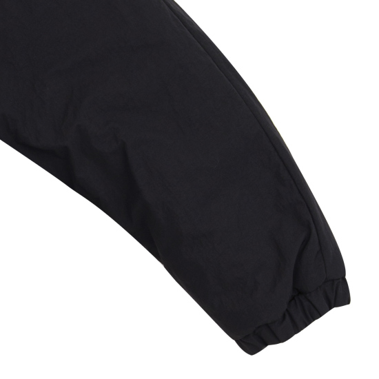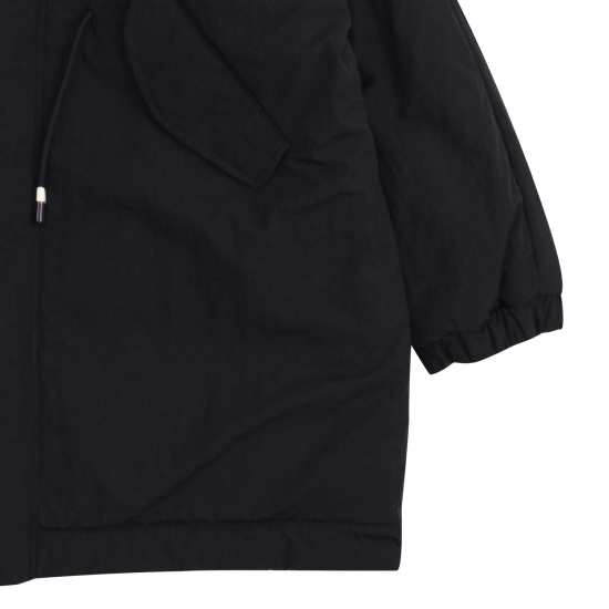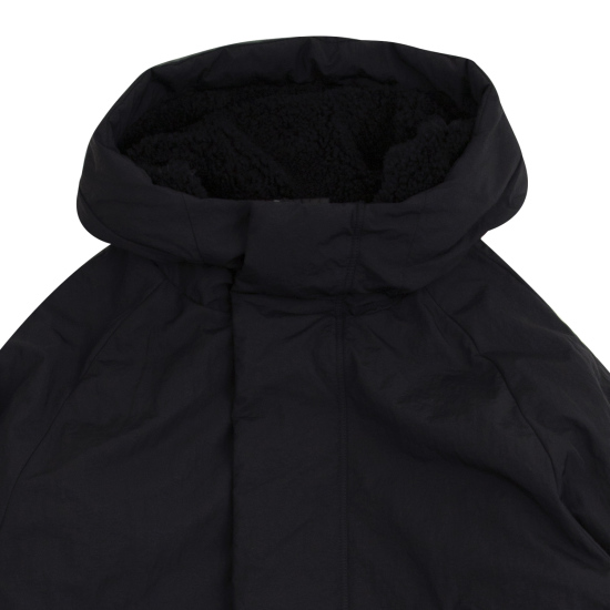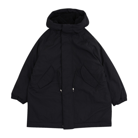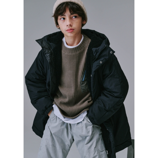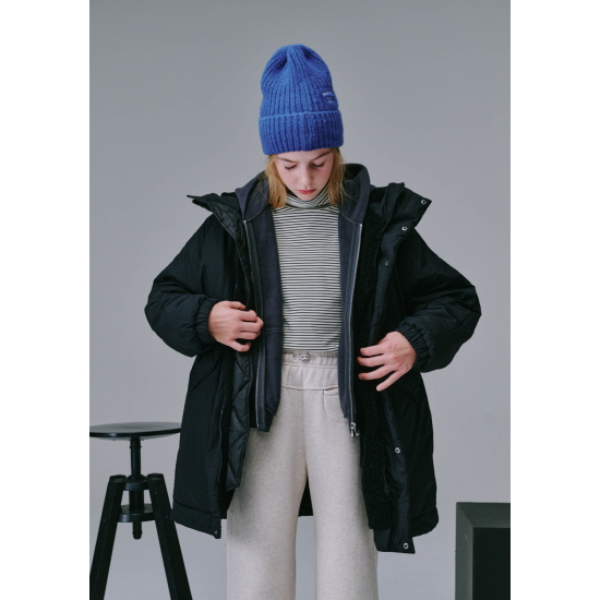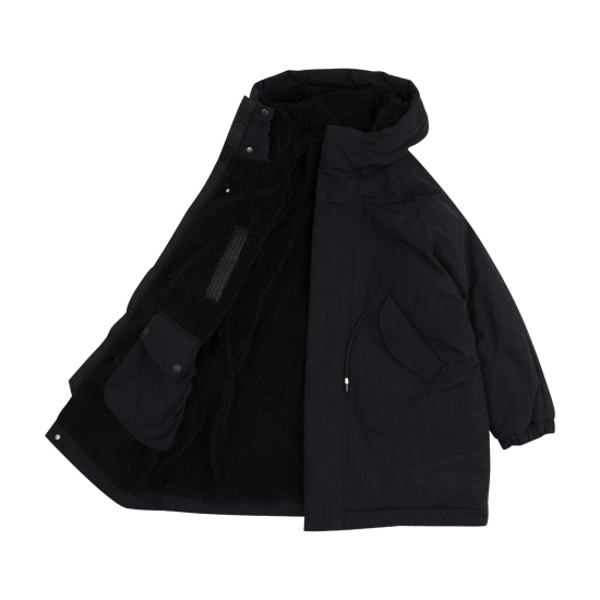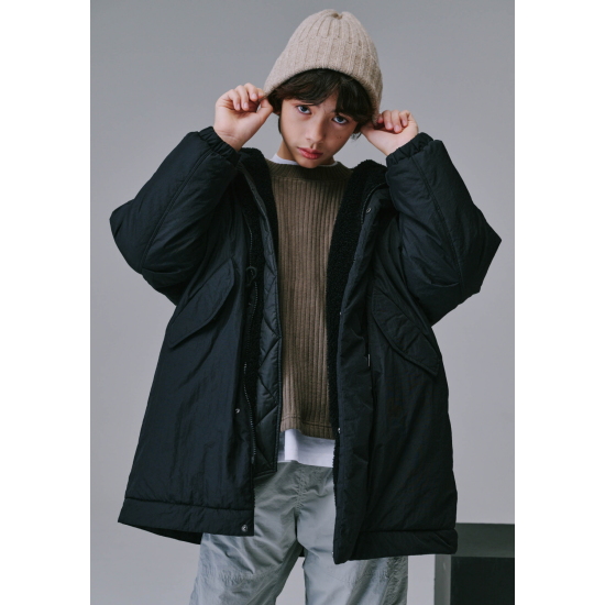 겉은 광택있는 블랙 화섬, 안쪽은 블랙 보아로 제안한 리버시블 야상 점퍼입니다. 허벅지 중간 정도 오는 미드 기장으로 제안하였습니다. 겉쪽 화섬은 야상을 미니멀하게 해석한 시크함이 돋보이고, 안쪽 보아는 포근함을 살린 아웃도어 배색 포켓이 눈에 띄는 아이템입니다. 두가지 스타일링을 할수 있는 메리트가 있는 점퍼입니다.