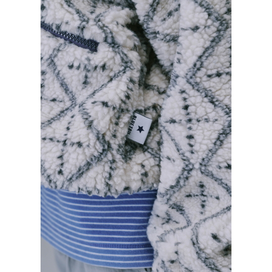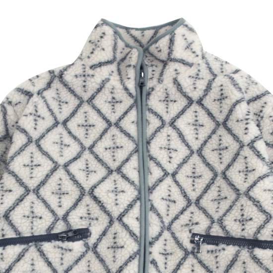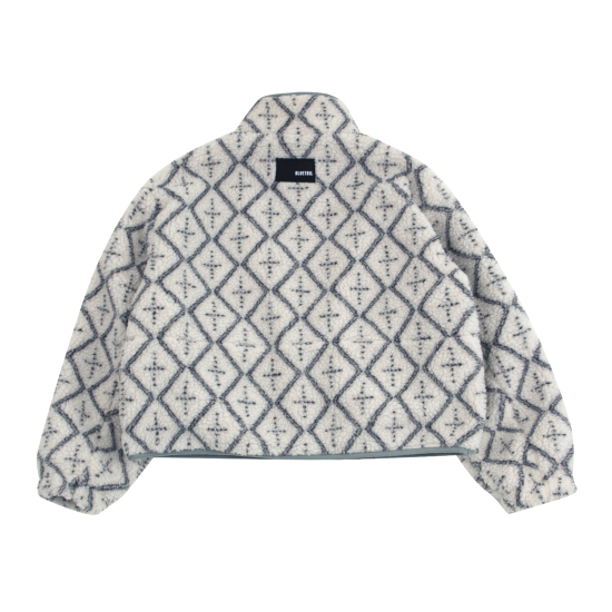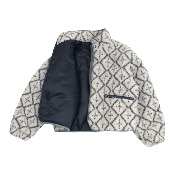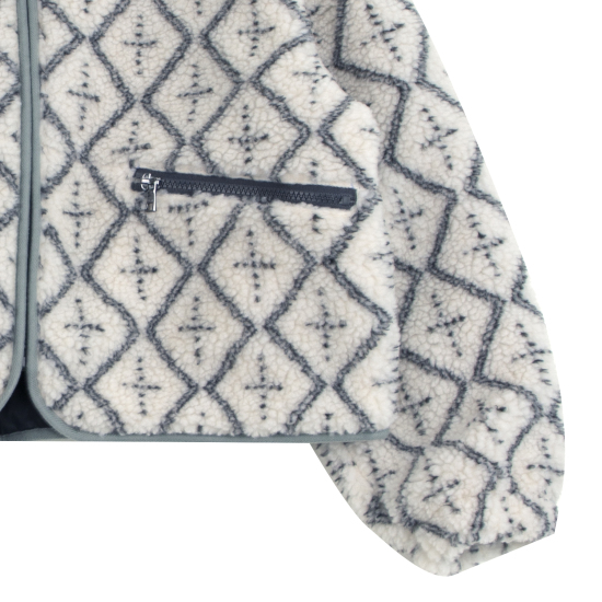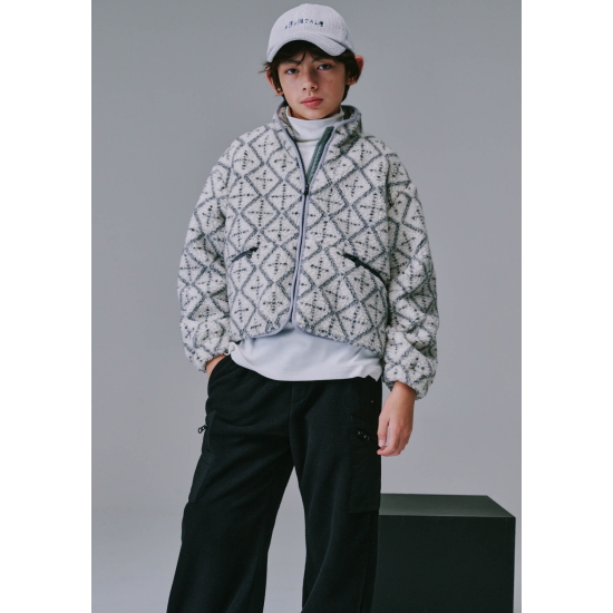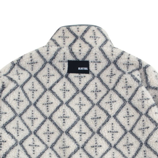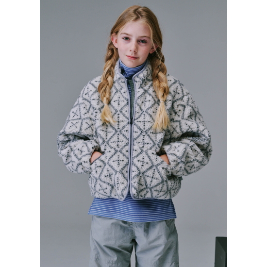 변형 다이아 패턴의 아이보리 컬러 보아 점퍼입니다. 기하학적이면서도 은은하게 배열된 패턴이 돋보이는 블루테일만의 개발 소재로 제안한 유니크한 아이템입니다. 배색 랍빠와 사선 지퍼 포켓으로 끝처리를 하여 가벼운 착용감으로 제안하였습니다. 크롭한 기장이지만 남녀 모두에게 부담스럽지 않은 트렌디한 핏으로 제안하였습니다.
