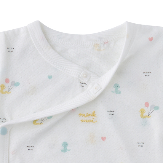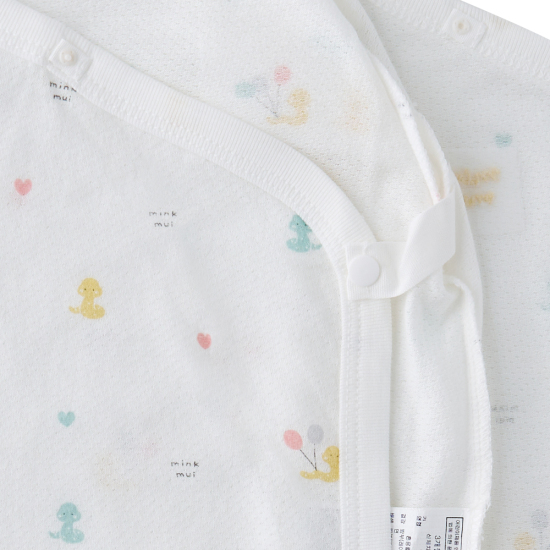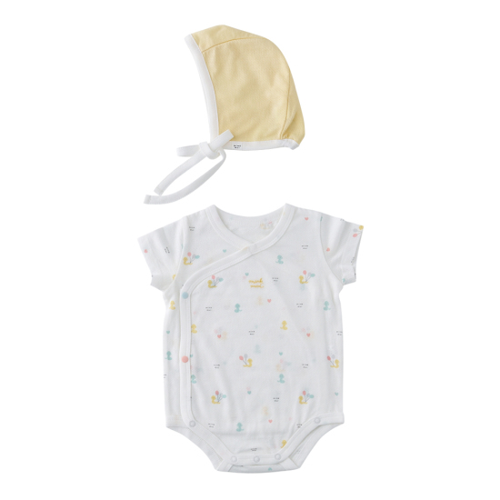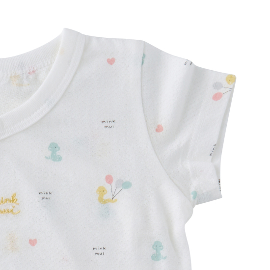 COOL COTTON 라인의 반팔 배내 바디슈트 상품입니다. 천연섬유인 대나무 원사를 사용하여 향균, 소취 기능이 탁월하며 시원한 메쉬 조직으로 짜여져 통기성이 좋은 뱀부 메쉬 원단을 사용하였습니다. 귀여운 뱀 캐릭터 패턴이 들어간 아이템입니다. 배내슈트와 옐로우 모자 SET 상품으로 25년도 뱀띠 해에 선물로도 좋은 아이템입니다.