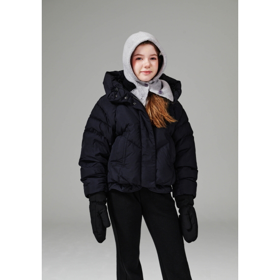 블랙 컬러 가벼운 나일론 소재로 제안하여 볼륨감이 물씬 느껴지는 숏 푸퍼 다운 점퍼입니다. 크롭 기장으로 제안해 쁘띠하게 코디하기 좋으며, 인체 라인을 따라 나뉘어진 사선의 유동적인 칸다운 스티치로 인하여 볼륨감이 매력적으로 보이는 상품입니다. 볼륨감을 해치지않는 포켓 디테일과, 얼굴을 포근하게 감싸는 입체적인 후드가 프로텍티브한 느낌을 더해줍니다. 하단의 퀼팅 플라이가 있어 크롭이 부담스럽게 느껴지지 않는 상품입니다.