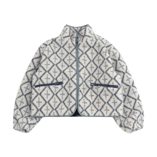 변형 다이아 패턴의 아이보리 컬러 보아 점퍼입니다. 기하학적이면서도 은은하게 배열된 패턴이 돋보이는 블루테일만의 개발 소재로 제안한 유니크한 아이템입니다. 배색 랍빠와 사선 지퍼 포켓으로 끝처리를 하여 가벼운 착용감으로 제안하였습니다. 크롭한 기장이지만 남녀 모두에게 부담스럽지 않은 트렌디한 핏으로 제안하였습니다.