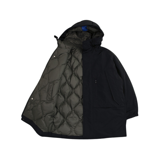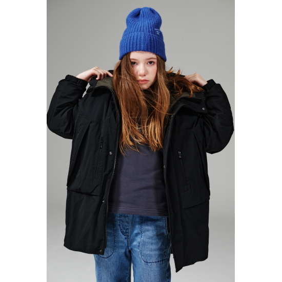 블랙 컬러 메모리 소재로 제안한 미드 기장 리버시블 오리털 점퍼입니다. 겉쪽은 사선 후다 포켓과 지퍼 포켓이 있어 멀티 수납이 가능한 미니멀한 야상 느낌을 주며, 뒤집은 안쪽은 카키쉬 그레이 컬러가 매력적인 물결 퀼팅 오리털 점퍼입니다. 후드 입구에 컬러감있는 테잎이 라벨링 효과를 주면서 옷을 간단히 걸 수 있게 되어 있습니다.