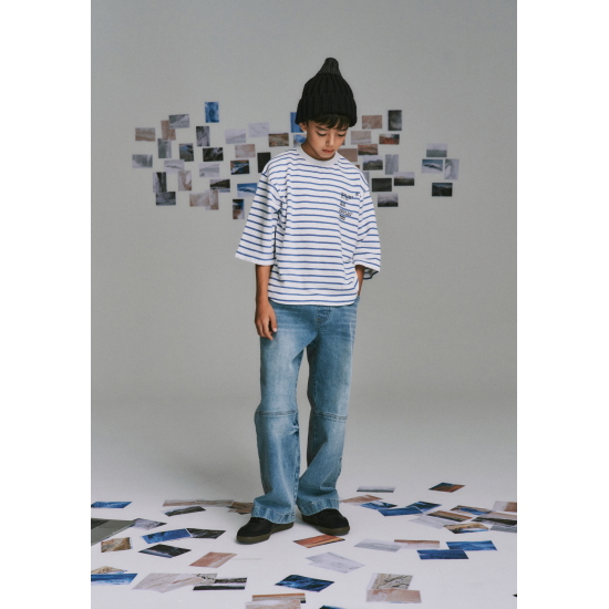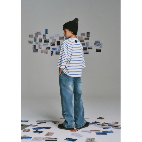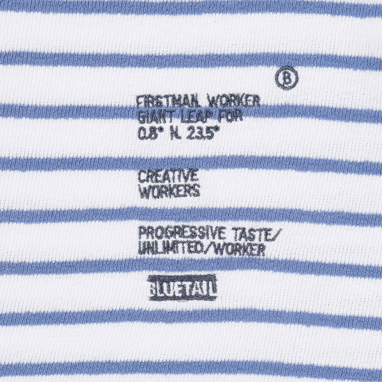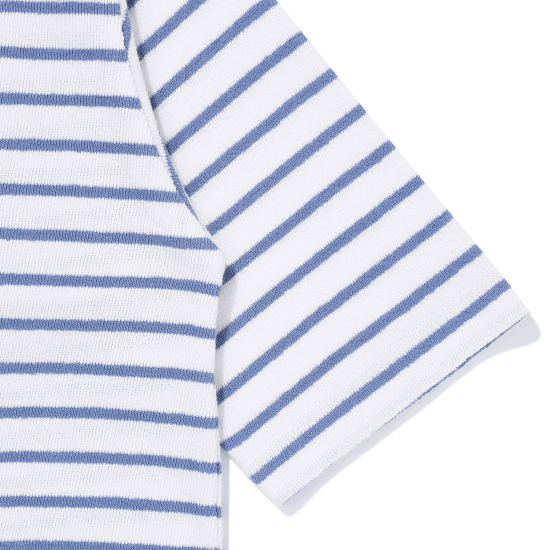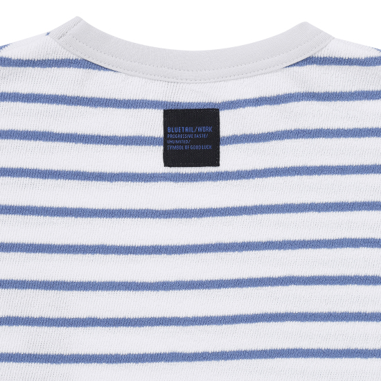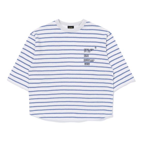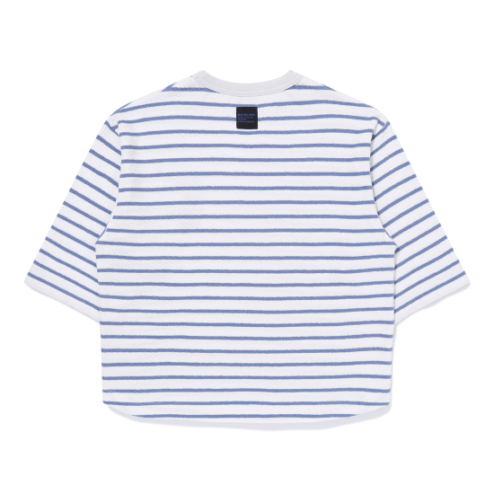 유니크한 요철감 있는 소재가 매력적인 스트라이프 7부 소매 티셔츠입니다. 넥 라인에 밝은 그레이 컬러로 배색을 넣고 레터링 자수로 포인트를 준 상품입니다.