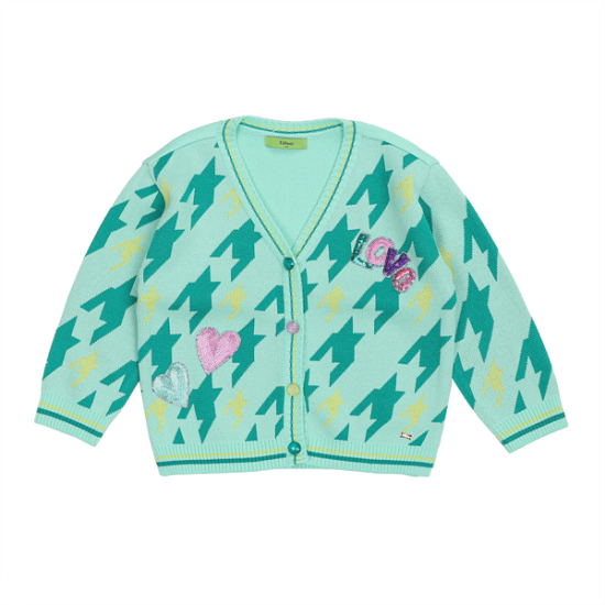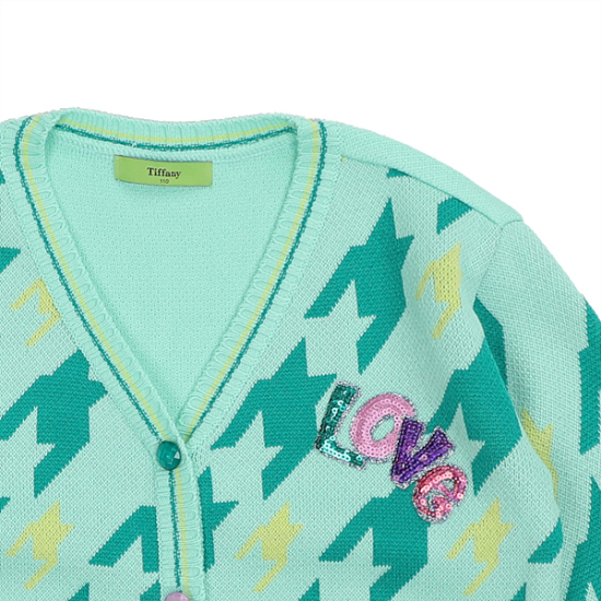 하운즈투스 패턴 자카드 니트 가디건으로 약간 롱 기장 스타일입니다. 앞쪽에 스팽글 와펜 장식으로 컬러 포인트를 준 스타일로 원피스나 스커트 등에도 레이어드하기 좋은 스타일입니다.