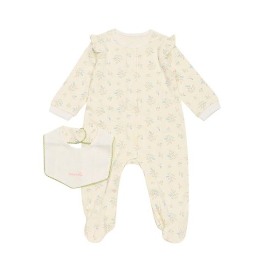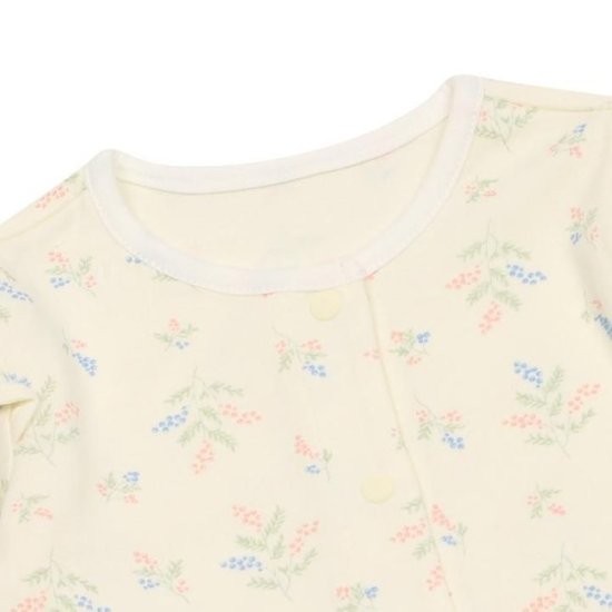 아주 부드러운 모달소재에 여성스러운 꽃무늬를 디자인 한 우주복과 턱받이 세트로, 아가들이 편안하고 예쁘게 입을 수 있는 우주복입니다.
