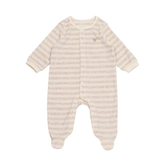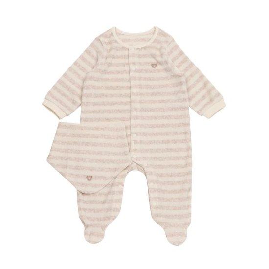 부드러운 타월지로 편한 색감의 모자세트로 된 우주복입니다