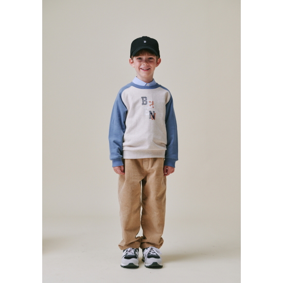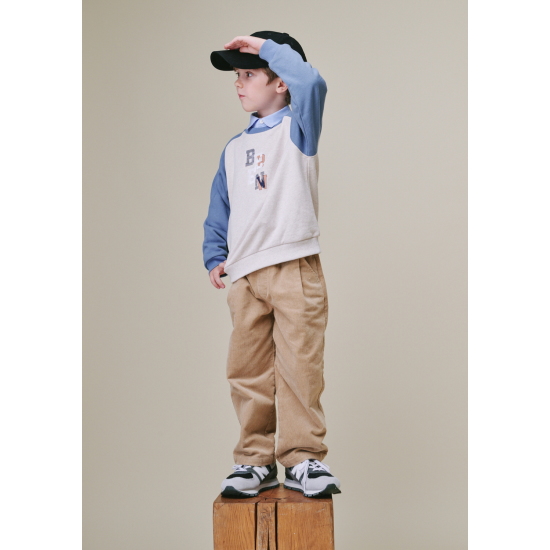 블루 컬러의 데님 팬츠, 베이지 컬러의 코듀로이 팬츠와 함께