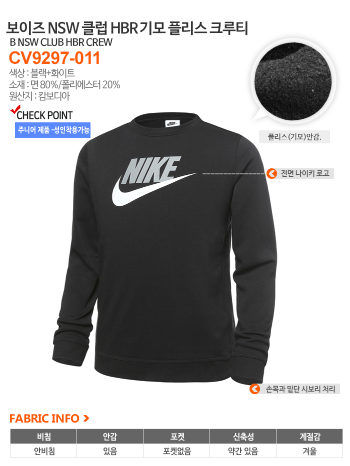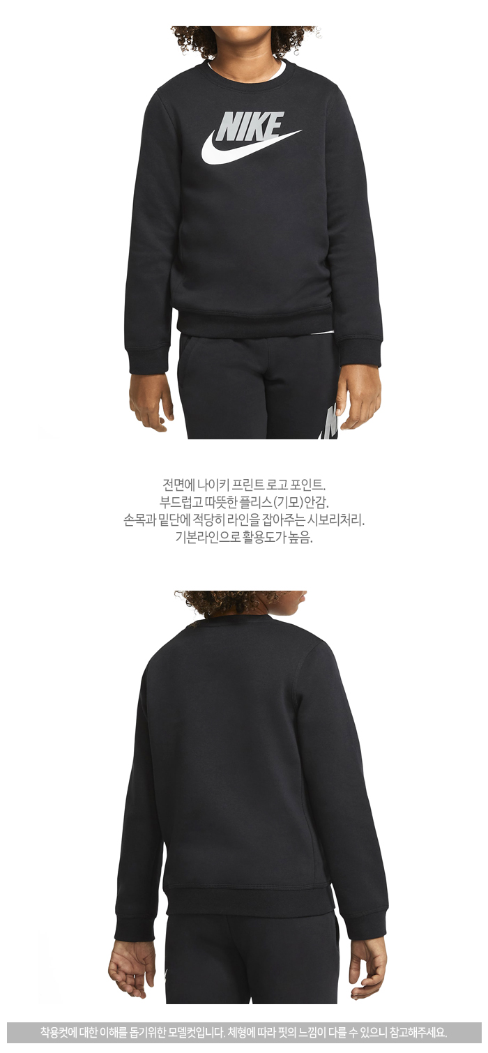 나이키 키즈 NSW 빅로고 맨투맨 기모 플리스 크루티 CV9297-011