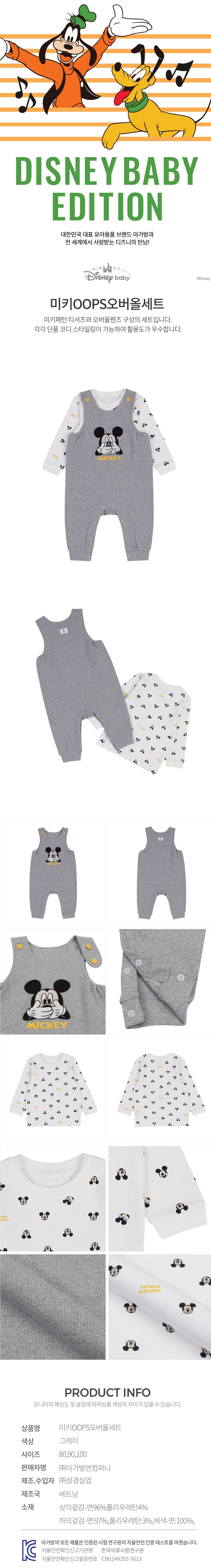 귀여운 미키 캐릭터 얼굴이 들어간 라운드 티셔츠와 오버올 세트 구성.