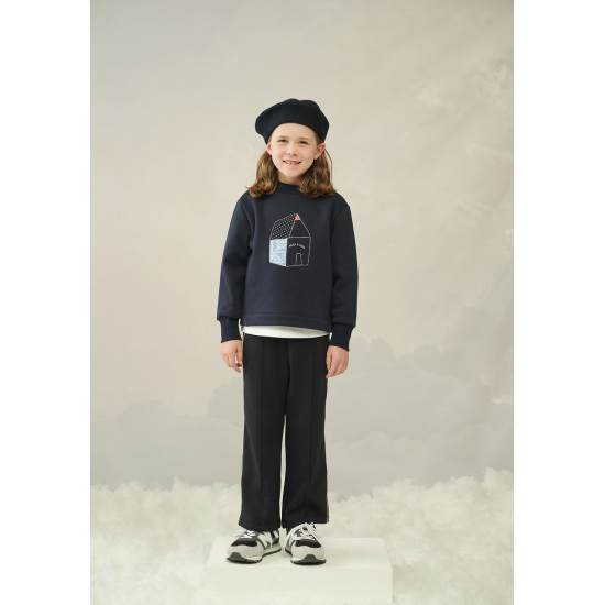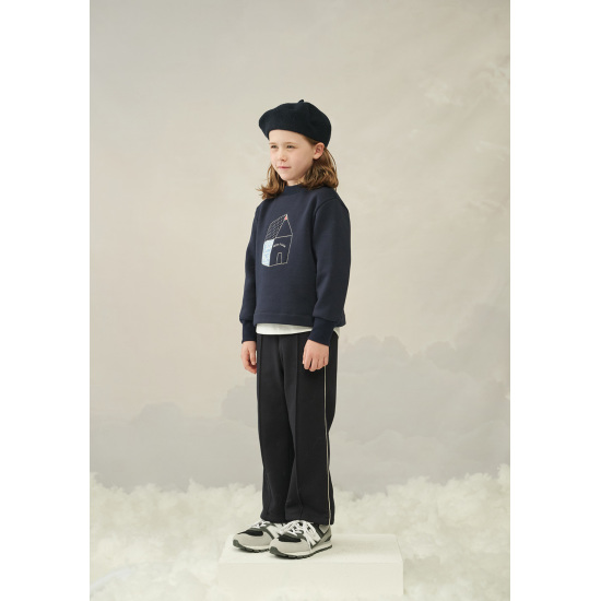 같은 소재, 컬러의 네이비 티셔츠와 함께 셋업으로 입고 그레이 컬러의 오리털 다운 점퍼 또는 라이트 베이지 컬러의 야상 오리털점퍼 등과 매치하여 활동적인 여아의 스타일링을 제안할 수 있습니다.