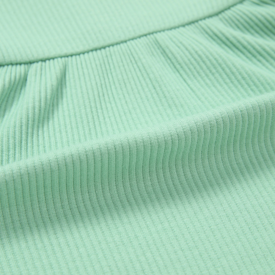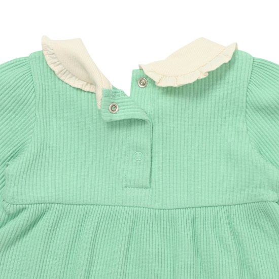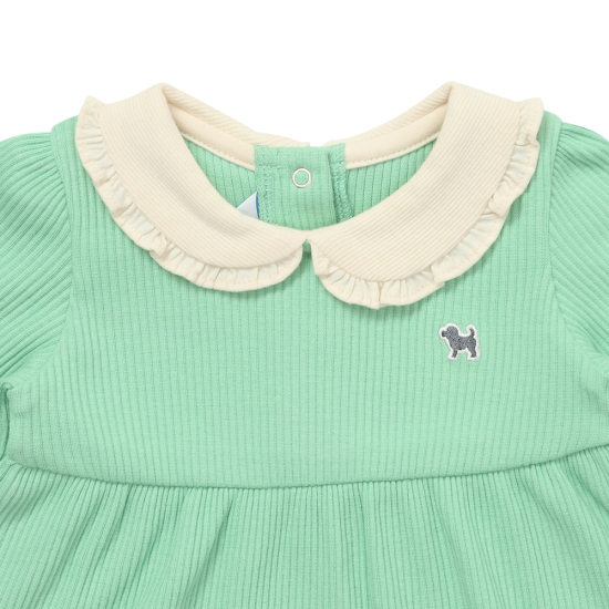 저지소재의 여아상하세트 아이템입니다. 포근한 민트 컬러위에 프릴 카라가 매치되어있는 상하세트입니다.