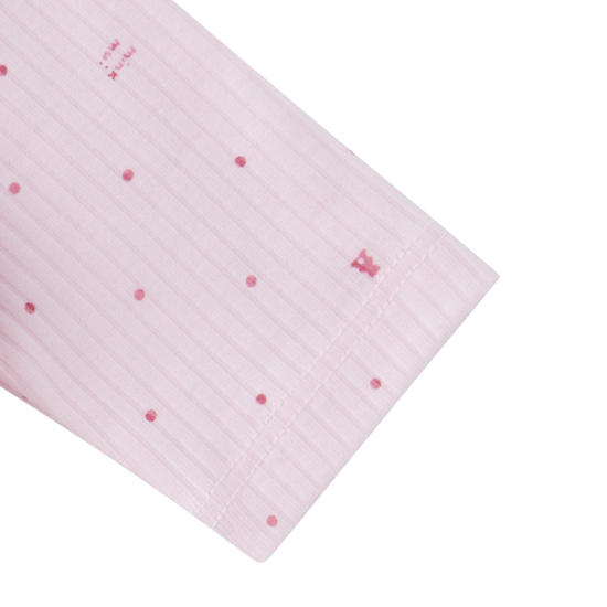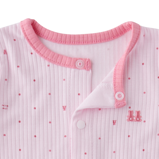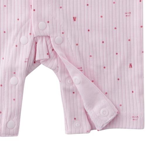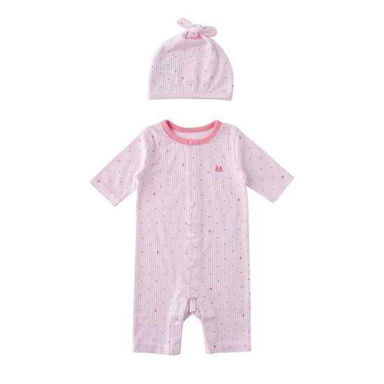 밍크뮤 시그니처 패턴 이 들어간 핑크 컬러 우주복과 모자 SET 상품으로 아기들에게 선물용으 로 구성하기 좋은 아이템입니다.