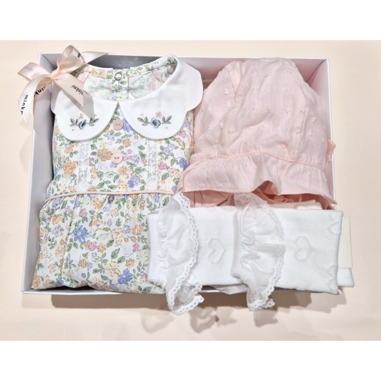 부드러운 면 소재에 꽃잎모양 카라와 플라워 자수로 포인트를 주었으며, 핑크 컬러의 보넷과 세트로 구성하여 러블리함을 더한 아이템입니다.